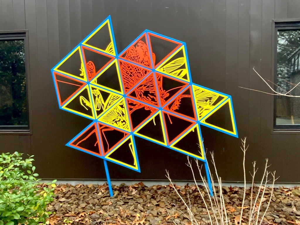 “Mantis”. Fabricated steel and powder coat. 9′ x 9′. Bela Vista Public Library.